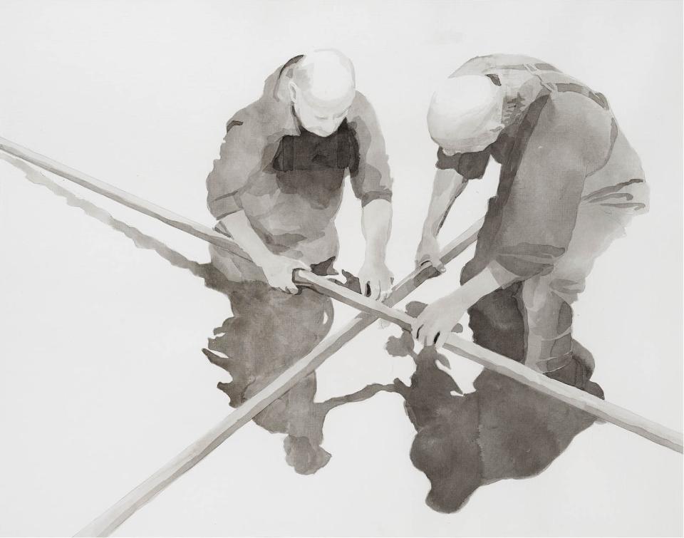 Plucked from a moment in time and perhaps oblivious to the part they play in the patterns of the things around them, people are disjointed, apart from one another. They are enclosed, wrapped up in the separateness of their inner worlds. The spaces between them speak louder than the people themselves. Patterns fill these spaces, connecting yet holding the people apart.