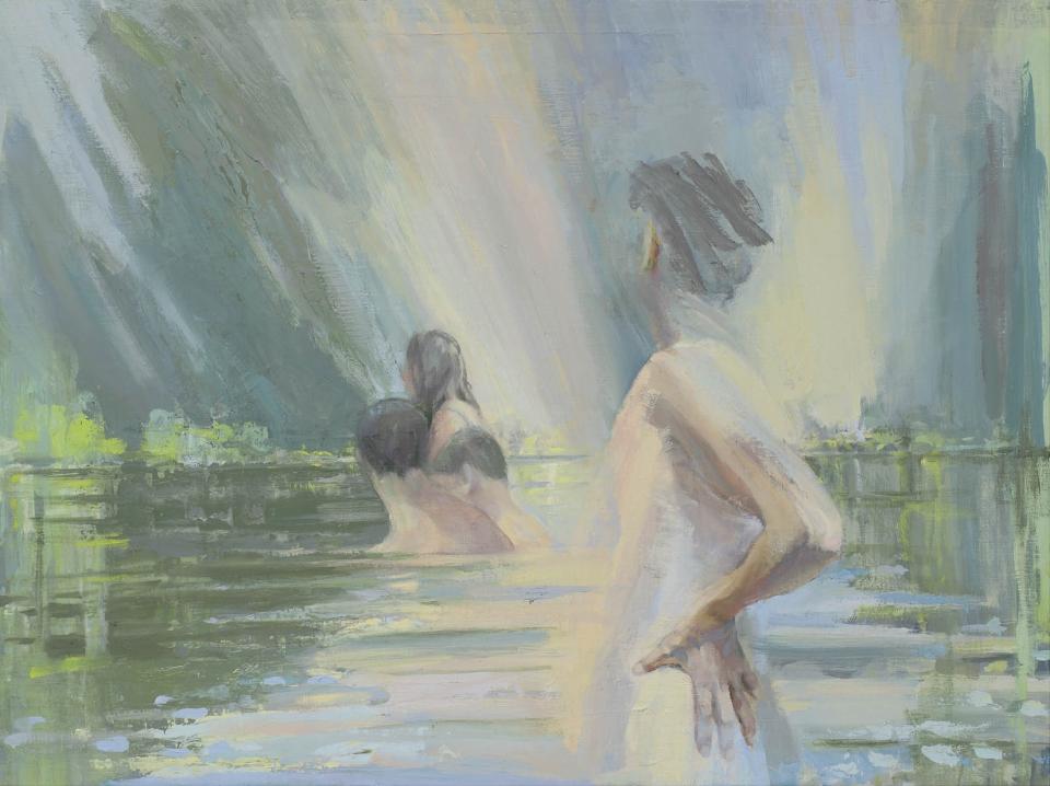 The experience of being underwater is a recurrent theme. We move and behave differently, our body language is less controlled and more revealing. Sometimes the water cocoons the figure, centring it back to the internal world. Other figures are seen from underwater, weightless, some without heads, their expression coming out in body, shape and movement alone. At times the silence and stillness of the underwater space is thrown into relief by the agitation of life on the surface.