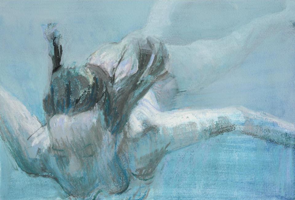The experience of being underwater is a recurrent theme. We move and behave differently, our body language is less controlled and more revealing. Sometimes the water cocoons the figure, centring it back to the internal world. Other figures are seen from underwater, weightless, some without heads, their expression coming out in body, shape and movement alone. At times the silence and stillness of the underwater space is thrown into relief by the agitation of life on the surface.