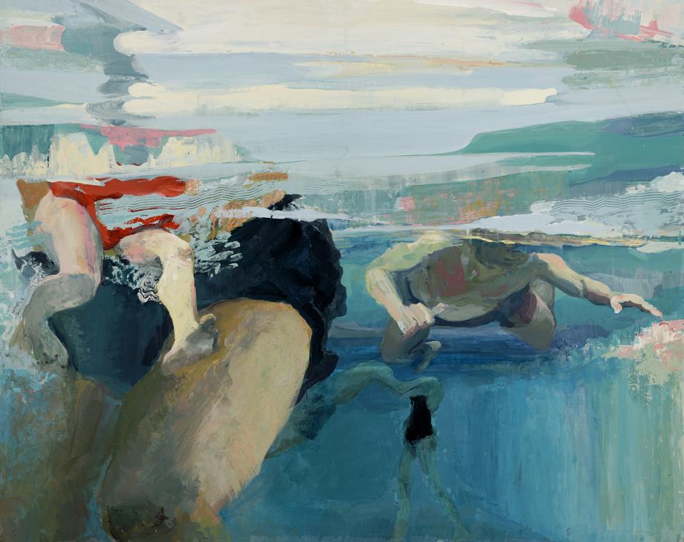 The experience of being underwater is a recurrent theme. We move and behave differently, our body language is less controlled and more revealing. Sometimes the water cocoons the figure, centring it back to the internal world. Other figures are seen from underwater, weightless, some without heads, their expression coming out in body, shape and movement alone. At times the silence and stillness of the underwater space is thrown into relief by the agitation of life on the surface.