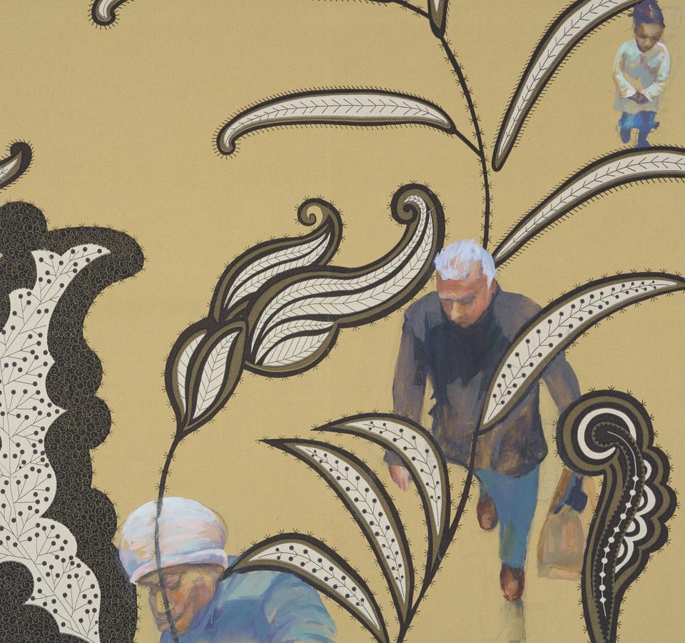 Plucked from a moment in time and perhaps oblivious to the part they play in the patterns of the things around them, people are disjointed, apart from one another. They are enclosed, wrapped up in the separateness of their inner worlds. The spaces between them speak louder than the people themselves. Patterns fill these spaces, connecting yet holding the people apart.