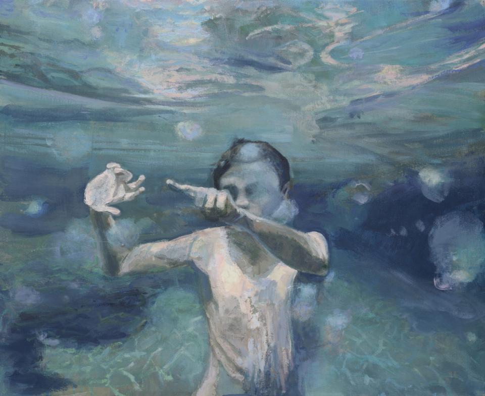 The experience of being underwater is a recurrent theme. We move and behave differently, our body language is less controlled and more revealing. Sometimes the water cocoons the figure, centring it back to the internal world. Other figures are seen from underwater, weightless, some without heads, their expression coming out in body, shape and movement alone. At times the silence and stillness of the underwater space is thrown into relief by the agitation of life on the surface.
