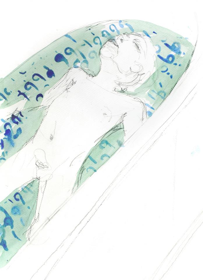 The experience of being underwater is a recurrent theme. We move and behave differently, our body language is less controlled and more revealing. Sometimes the water cocoons the figure, centring it back to the internal world. Other figures are seen from underwater, weightless, some without heads, their expression coming out in body, shape and movement alone. At times the silence and stillness of the underwater space is thrown into relief by the agitation of life on the surface.