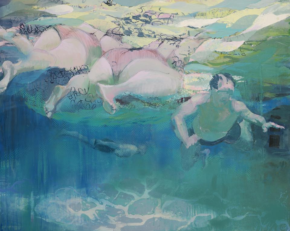 The experience of being underwater is a recurrent theme. We move and behave differently, our body language is less controlled and more revealing. Sometimes the water cocoons the figure, centring it back to the internal world. Other figures are seen from underwater, weightless, some without heads, their expression coming out in body, shape and movement alone. At times the silence and stillness of the underwater space is thrown into relief by the agitation of life on the surface.