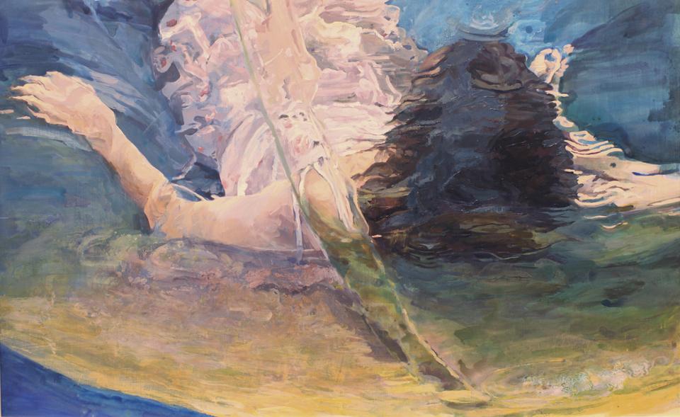The experience of being underwater is a recurrent theme. We move and behave differently, our body language is less controlled and more revealing. Sometimes the water cocoons the figure, centring it back to the internal world. Other figures are seen from underwater, weightless, some without heads, their expression coming out in body, shape and movement alone. At times the silence and stillness of the underwater space is thrown into relief by the agitation of life on the surface.